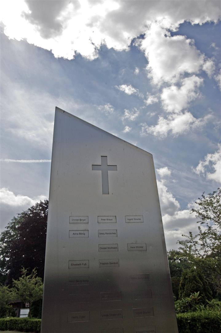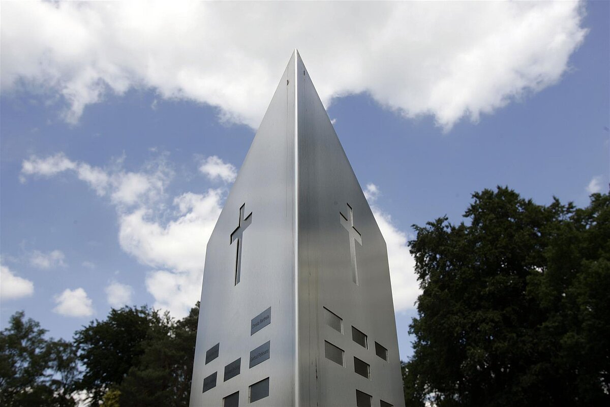 An einer Stele wird ein Schild mit dem Namen des Bestatteten angebracht.